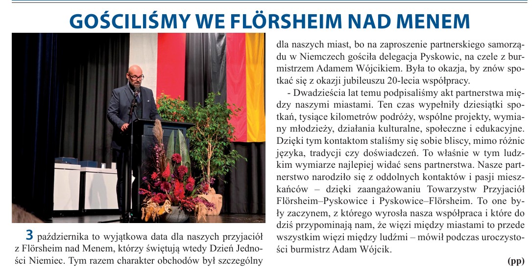 „Vor zwanzig Jahren haben wir die Partnerschaft zwischen unseren Städten besiegelt. Diese Zeit war erfüllt von Dutzenden Begegnungen, Tausenden von Reisekilometern, gemeinsamen Projekten, Jugendaustauschen sowie kulturellen, sozialen und Bildungsaktivitäten. Durch diese Kontakte sind wir uns nahegekommen – trotz sprachlicher, kultureller und erfahrungsbedingter Unterschiede. Gerade in dieser menschlichen Dimension zeigt sich der wahre Wert einer Partnerschaft. Unsere Verbindung entstand aus dem Engagement und der Leidenschaft der Bürgerinnen und Bürger – dank der Freundeskreise Flörsheim–Pyskowice und Pyskowice–Flörsheim. Sie waren der Ursprung unserer Zusammenarbeit und erinnern uns bis heute daran, dass die Beziehungen zwischen Städten vor allem Beziehungen zwischen Menschen sind“, sagte Bürgermeister Adam Wójcik bei der Feierlichkeit.